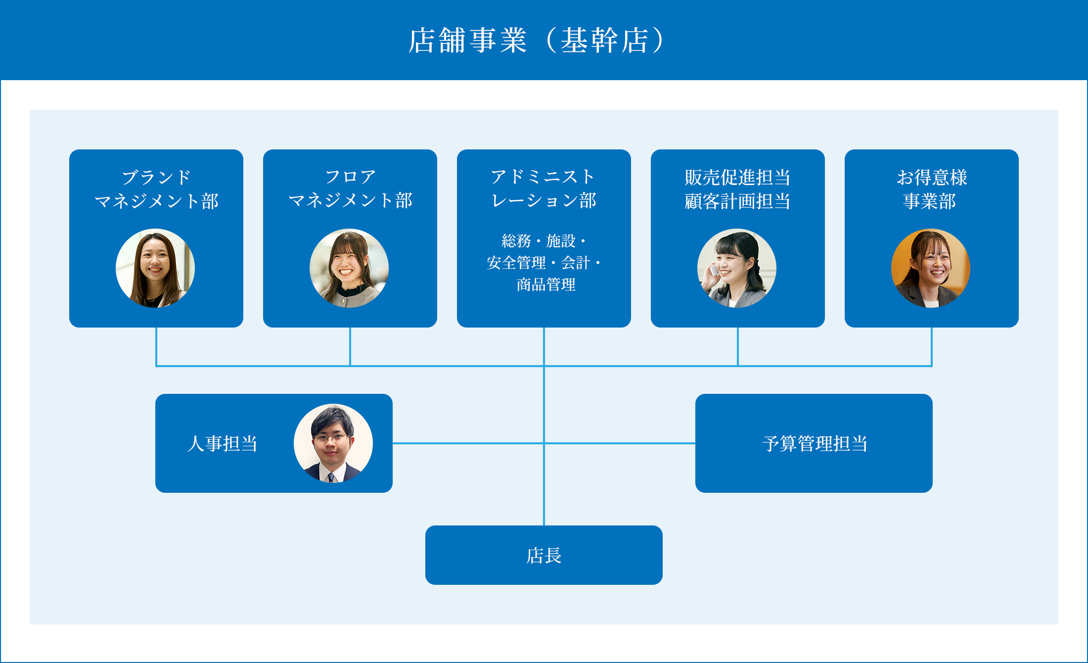 「百貨店」の仕事と聞くと、接客・販売をまず初めに思い浮かべる方も多いと思います。しかし、総合職の社員のうち、売場での接客・販売をメインの業務としている「販売スタッフ」は約4%しかいません。多くは、上得意のお客さまを対象としたお得意様セールス、法人・団体向けのBtoBビジネスを行う商事セールス、マーチャンダイザー、販売促進、マネジメント、経営企画・人事・総務・会計・商品管理といった管理系の業務などを担当しています。
